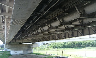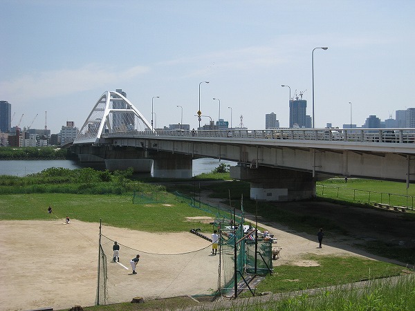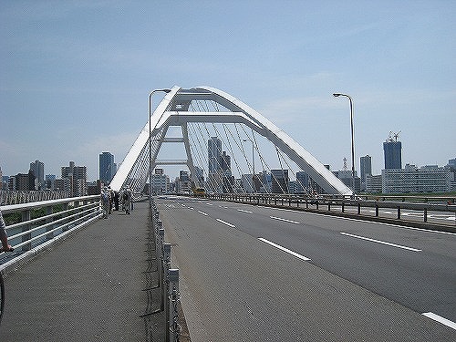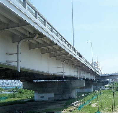 現在の長柄橋は、昭和58年に完成したもので、中央部の橋はニールセンローゼ桁というアーチ形の橋が
