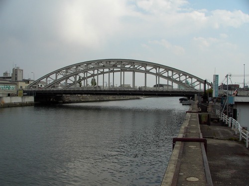 難波泉尾線の橋として架設されたトラス状の鋼アーチ橋で、非常に重厚な感じがします。