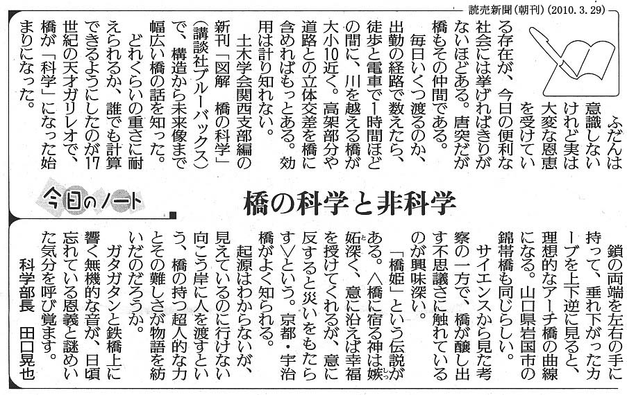 ・ 田中輝彦著「図解 橋の科学」の新聞論評 (読売新聞(2010.3.29)朝刊)
