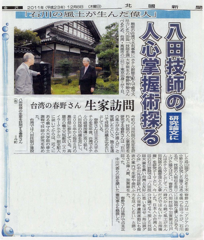 ・ 八田與一技師関連記事 (北国新聞(2011.12.8))
