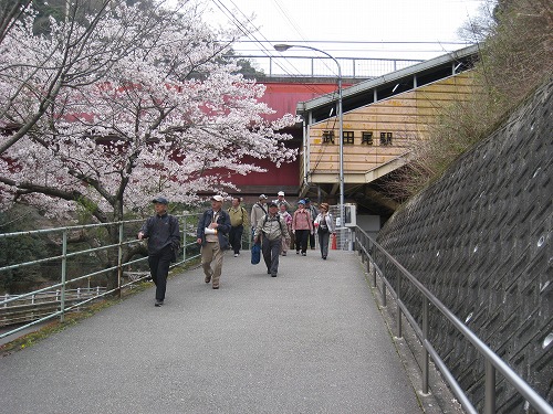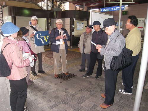 武田尾駅のコンコースで出発前の説明、注意を聞く参加の皆さん