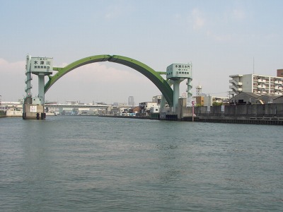 この水門は、アーチの部分を上流側に倒し沈めて、高潮を防ぐ仕組みになっています。