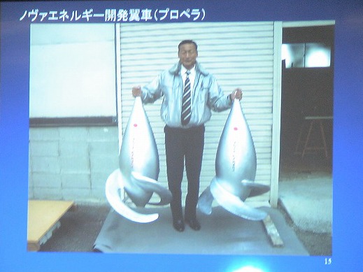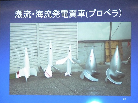 (質疑)プロペラに海中生物は障害とならいないか。 振動による疲労破壊は考えられないか。 音が出ると魚は寄ってくる。このプロペラの翼は 長くないので、音は出ない。魚は寄ってこない。 翼の取り付けは360度方向転換可能となって おり、こいのぼりのようにフレキシブルで振動は 少ない。 |