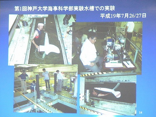 平成19年7月26日、27日、神戸大学 海事科学部実験水槽で実験。 平成20年3月5日に第2回実験を行っている。 |