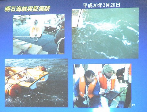平成20年2月20日に、「本マグロ1号」 「本マグロ2号」を使用して、明石海峡で初の 実証実験を行い、200Wの発電を確認した。 この様子はNHK TV で放映された。 |