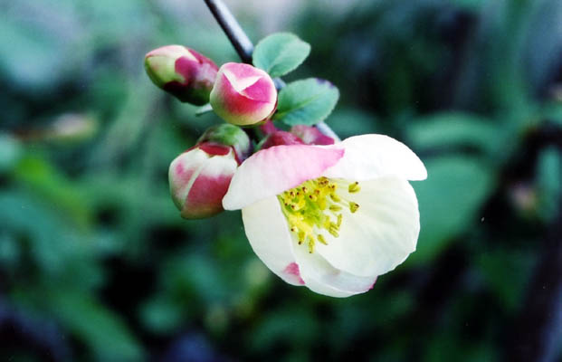 <ぼけ>の花です。 9月ごろには実が5cmくらいになり、それを焼酎につけます。 梅酒とは一味違うサッパリした風味で、夏場の飲み物に最適です。