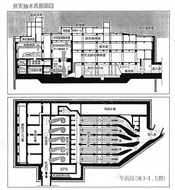 | 建物は、地上1階、地下5階建で、地下4、5階に雨天ポンプ室、雨水沈砂池が設けられている。 |